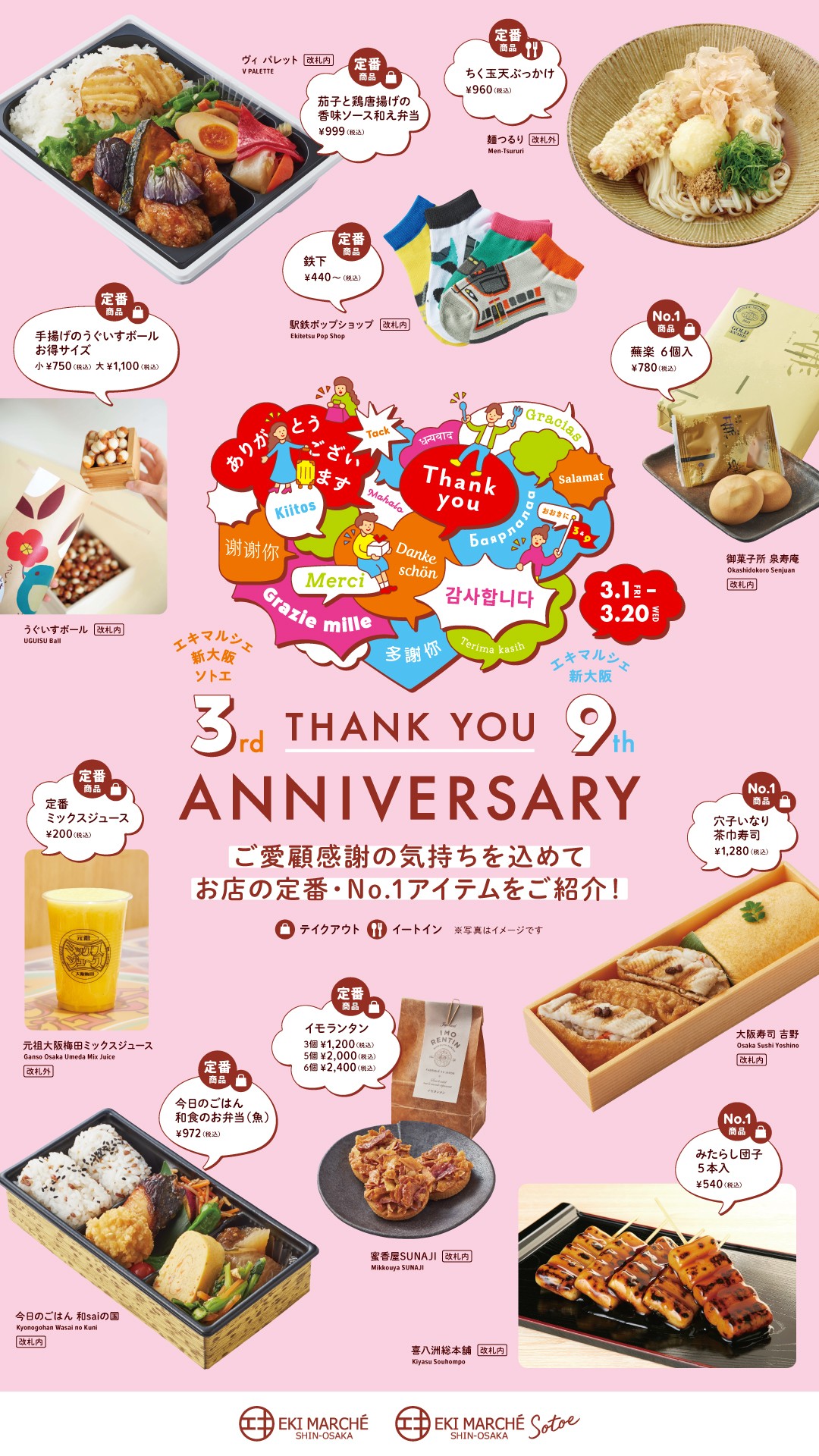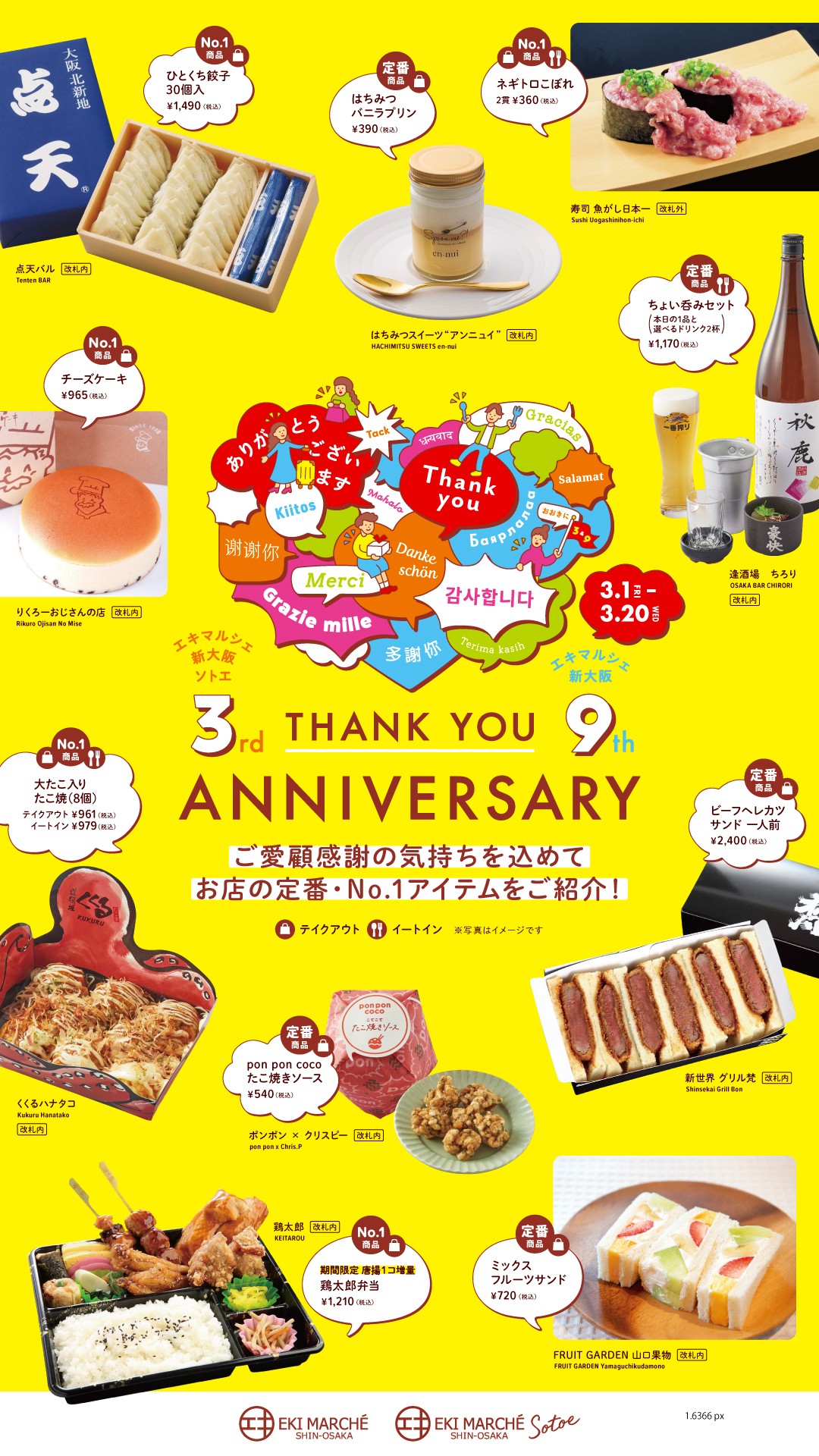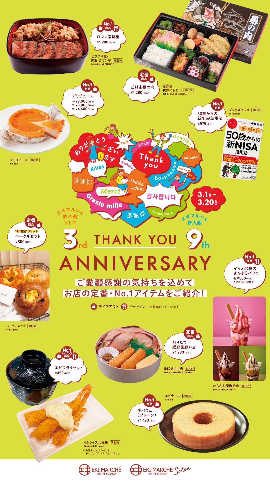 «Eki marche Osaka de la Espinilla», «el eki marche Osaka de la Espinilla Sotoe» alcanza el noveno aniversario de la apertura, tercer aniversario cada uno en el marzo de 2024. ¡Conmemoro un aniversario y cambio el artículo estándar y el artículo NO1 de la tienda que tiene todos ustedes favorecen «GRACIAS» (3.9) con la apreciación en un concepto y lo introducen!