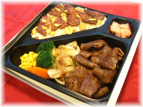 En la TIENDA DE COMESTIBLES PREPARADOS del emparrado del bistec de Kobe del rayo de carne de vaca japonés 36 años, el almuerzo que «quiere que usted coma por supuesto y puede probar totalmente el gusto y una fragancia de la vaca de Kobe genuina, carne de vaca negra japonesa para un sentimiento llamado...» se prepara mucho.