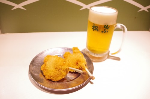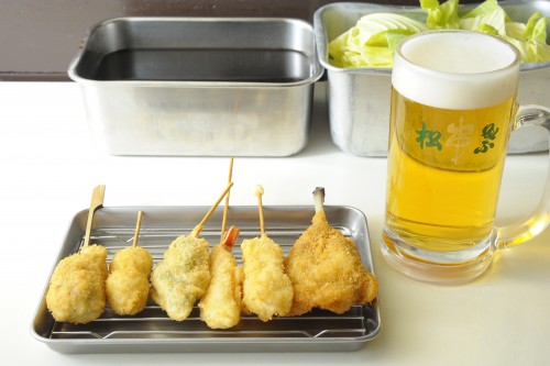 Siga apoyándose en Osaka local; y 70 años. Es la tienda que puede probar la carne de cerdo auténtica freída en un pincho en tiendas en la estación.