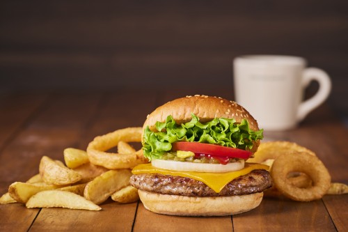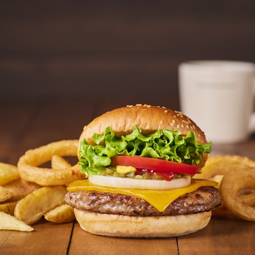 Proporciono las verduras que son frescas en un concepto en «la cafetería de la hamburguesa que un adulto es cómodo», el producto del fresco caliente ardiente.